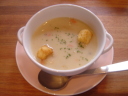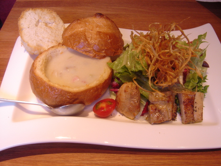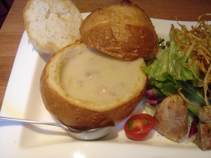 くりぬいたフランスパンの中に、クリームチャウダースープ。